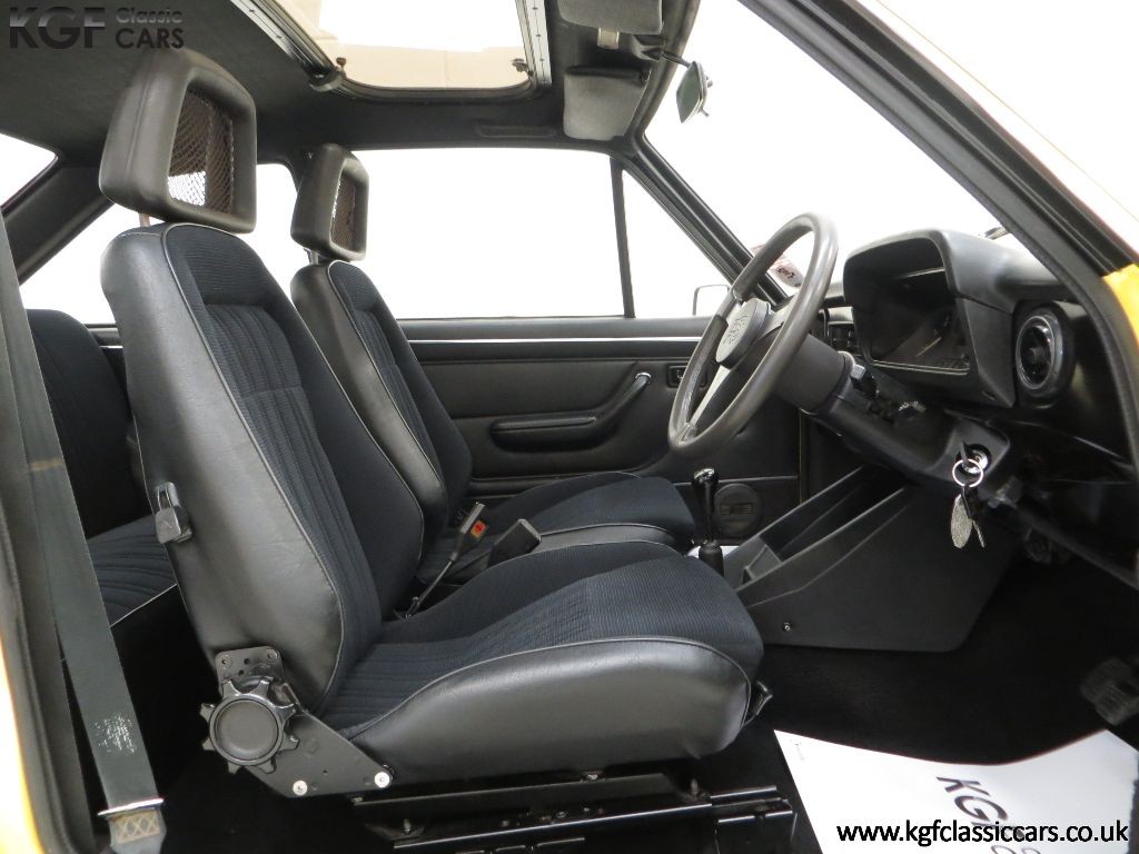 The exterior of this RS2000 is finished in factory correct Signal Yellow, (Code 9),which boasts a stunning shine and uniform finish. The polyurethane droop snoot is straight housing a set of four crystal clear Cibie 60/55W quartz-halogen headlamps. Genuine Altissimo rear light clusters are fitted and all trim sections are in good order. A later front grille with the blue oval badge and RS2000 decals on the rear quarters are fitted and all badges are in excellent order. The vehicle still has the correct plain Sekurit glass fitted as standard to early cars which is all number plate etched. A spotless colour coded underside reveals the excellent workmanship and will reassure this car is the real deal.