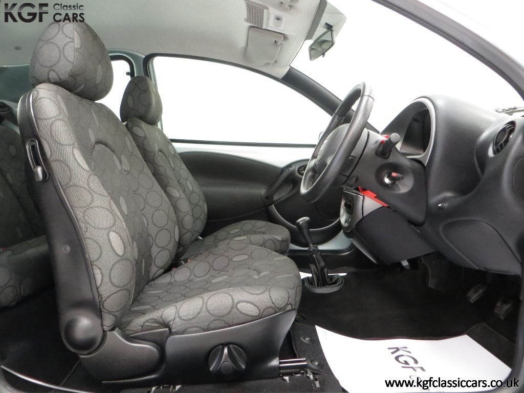 The interior of this cossetted example is beautifully clean and free from wear. The original Squeeze fabric upholstery in Aqua Jade colour scheme, (Code JE),is spotless with no wear or damage to the fabric whatsoever. The carpets are pristine and are protected by Ford Ka carpet mats and the headlining is perfect. The leather steering wheel has very slight deterioration, a common issue, but this does not detract from a remarkably well-preserved cabin space. The funky blob style fascia and incorporated switchgear is as new and all functions operate seamlessly including the original Model 6000 stereo CD. Likewise, the spotless load space boasts an unmarked carpet underneath which the boot floor is as new. Clean, fresh and totally unspoilt.