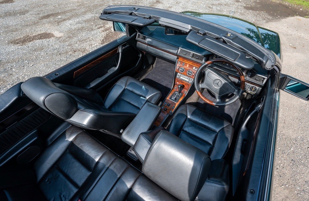 Finished in Spruce Green metallic, this full-four-seater cabriolet retains all of its sleek lines and taut, low-slung profile. Remember, this is a true Sportline (not just rebadged) so it rides that little bit lower. The finish remains generally excellent across the whole of the car with a deep gloss all over, and is set off nicely by the contrasting black hood. The black roof is in largely very good order; robust and quite presentable. There are a couple of small areas of wear to the material on the nearside rear buttress. A completely new mohair hood is also supplied with the car, but the new owner has the option of keeping the original as well.