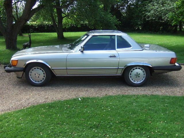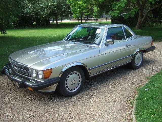 1986 Mercedes 560SL Convertible. LHD. Metallic Smoke Silver with Black leather and Black soft top. Factory hard top, 4-speed automatic, power steering, automatic climate control ( blows cold ),cruise control, central locking, tinted glass, electric windows, ABS anti-lock braking system, air bag, passenger electric mirror, new Pioneer CD Stereo with USB port and electric aerial, factory alloy wheels, factory alarm, stainless steel wheel arch guards ( removed as we don’t like them but will come with the car ) and door edge guards etc. California and Arizona car from new so dry-state and corrosion free. 114,000 miles which is barely run in for one of these with original service book and hand books plus amazing documented service history and even has the original window sticker / invoice and warranty plate. In excellent condition throughout in a good colour combination and very usable. UK registered.