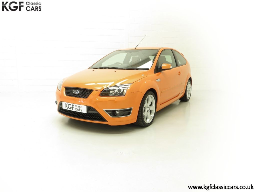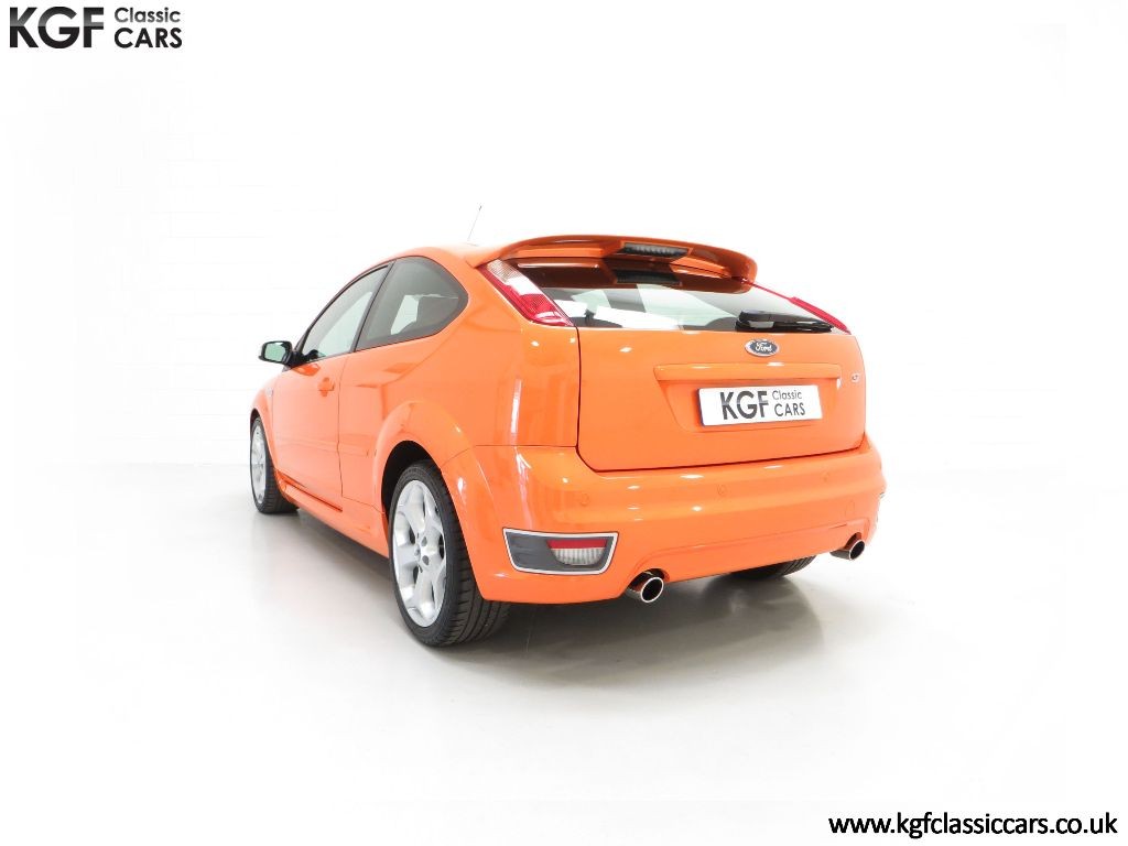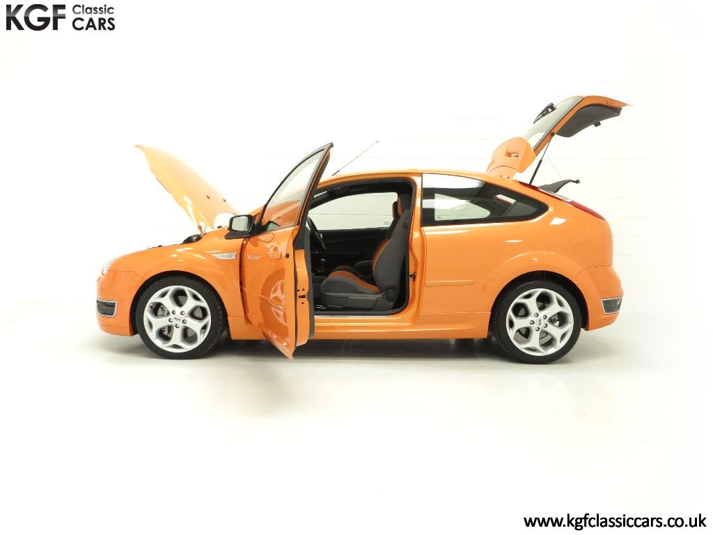 With a low 18,428 miles and two doting owners from new, this factory original and totally standard Focus ST is one for the collector. A desirable 3-door version in factory optional and highly sought-after Electric Orange, (Code 7 4), which was the signature launch colour. The car looks incredible and boasts a vibrant uniform shine throughout. The original paintwork is virtually unmarked and all panels are pin straight. There is a tiny touched in chip to the rear bumper and another almost undetectable mark to the rear wing. The underside is super clean thanks to garaged storage from new and even fragile labels to the underside components remain intact. Supplying Ford main dealer number plates are fitted and the new vehicle invoice reveals the original owner requested the Focus badge to be removed, keeping the letters in a bag! All light clusters are crystal-clear. Unmolested examples with such outstanding credentials are rarely found and this car will delight even the most meticulous buyer.