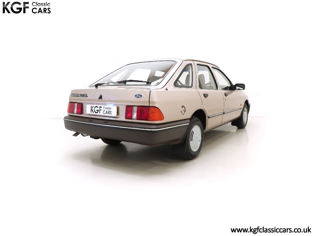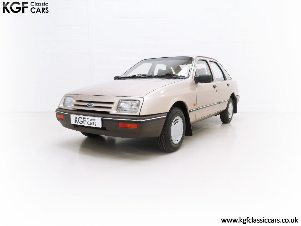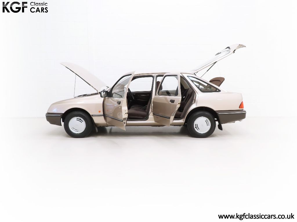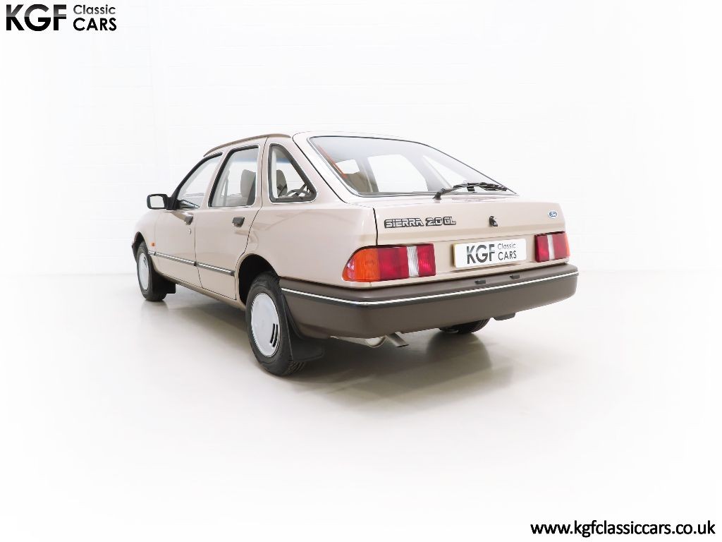 This exceptional and early Mk1 Ford Sierra 2.0 GL boasts impressive credentials of just two family owners and 27,013 miles from new. Finished in factory cost optional Metallic Champagne Gold, (Code O 3), the original finish is quite incredible with a rich and uniform shine. All factory panels remain fitted and the underside is in perfect structural order thanks to garage storage from new. A few markings to the excellent finish are barely worthy of mention such as some touched in chips to the bonnet and boot lid edge. All glass and rubbers are perfect factory fitment as are the light clusters and Lucas headlights with have been protected from new with optional Smoothy Light Guards. Original badges and model designation are in excellent condition and the supplying Ford Main Dealer number plates and tax disc holder remain with even the very first 1983 disc still in situ! One feature of this desirable early car is the absence of the D-Pillar Aerostrakes that were later fitted to the Sierra range in order improve crosswind stability. This car is an absolute credit to the two family custodians from new.