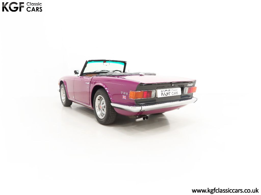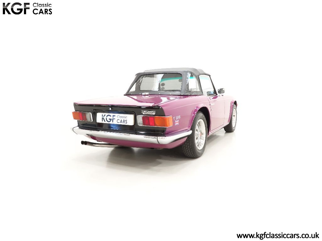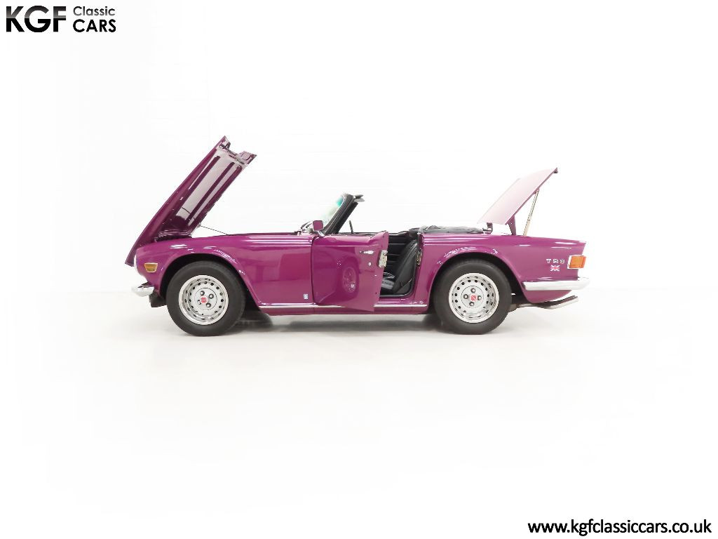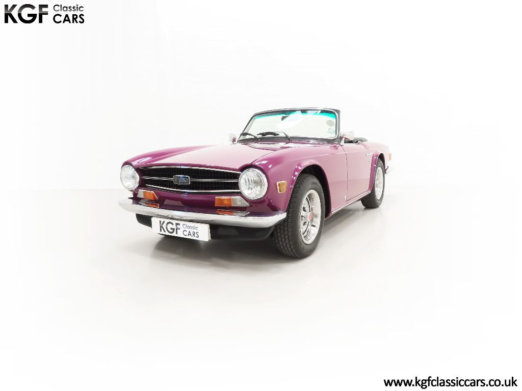 The Triumph TR6 needs little introduction in the world of classic British sports cars and this prime award-winning UK example is a brilliant testament to one of Coventry’s finest. Finished in the striking factory colour of Magenta, (Code 92), the paintwork looks amazing and boasts a deep, polished shine and uniform finish. The panel fit and gaps are remarkably good and far superior to those on the usual offerings. The hood and plastic screens are pristine and the fit is superb. The trim, mirror chrome and badges are in beautiful condition and period correct number plates with raised digits and even the supplying dealer tax disc holder remains fitted. Those seeking an example very close to standard will appreciate this fine example of this muscular, purposeful, no-nonsense British sports car.