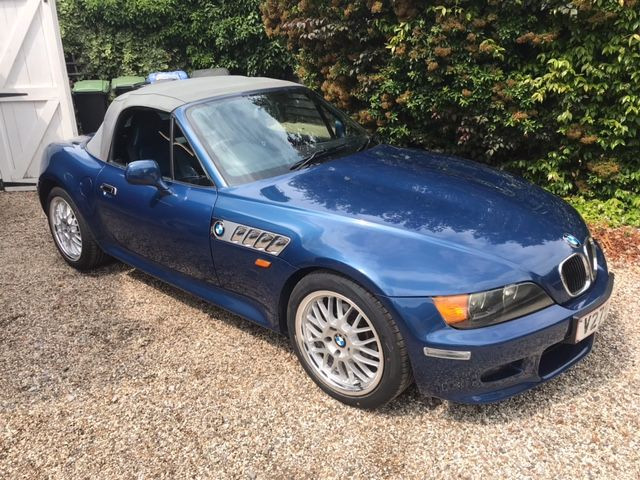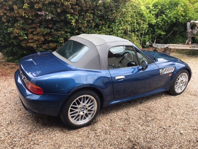 2000 BMW Z3 2.8i Roadster. Metallic Topaz Blue with rare Blue leather interior and Grey soft top. 5-speed manual, power steering, traction control, electric windows, electric seats, ABS braking, chrome side grills, electric mirrors, JVC CD stereo, remote alarm and central locking with 2 keys, 17” Motorsport style alloy wheels fitted with brand new tyres. 79,800 miles with substantial history folder going back to new including original service book and handbook pack. Jersey car from new. In excellent condition and great value for money for a Summer fun car.