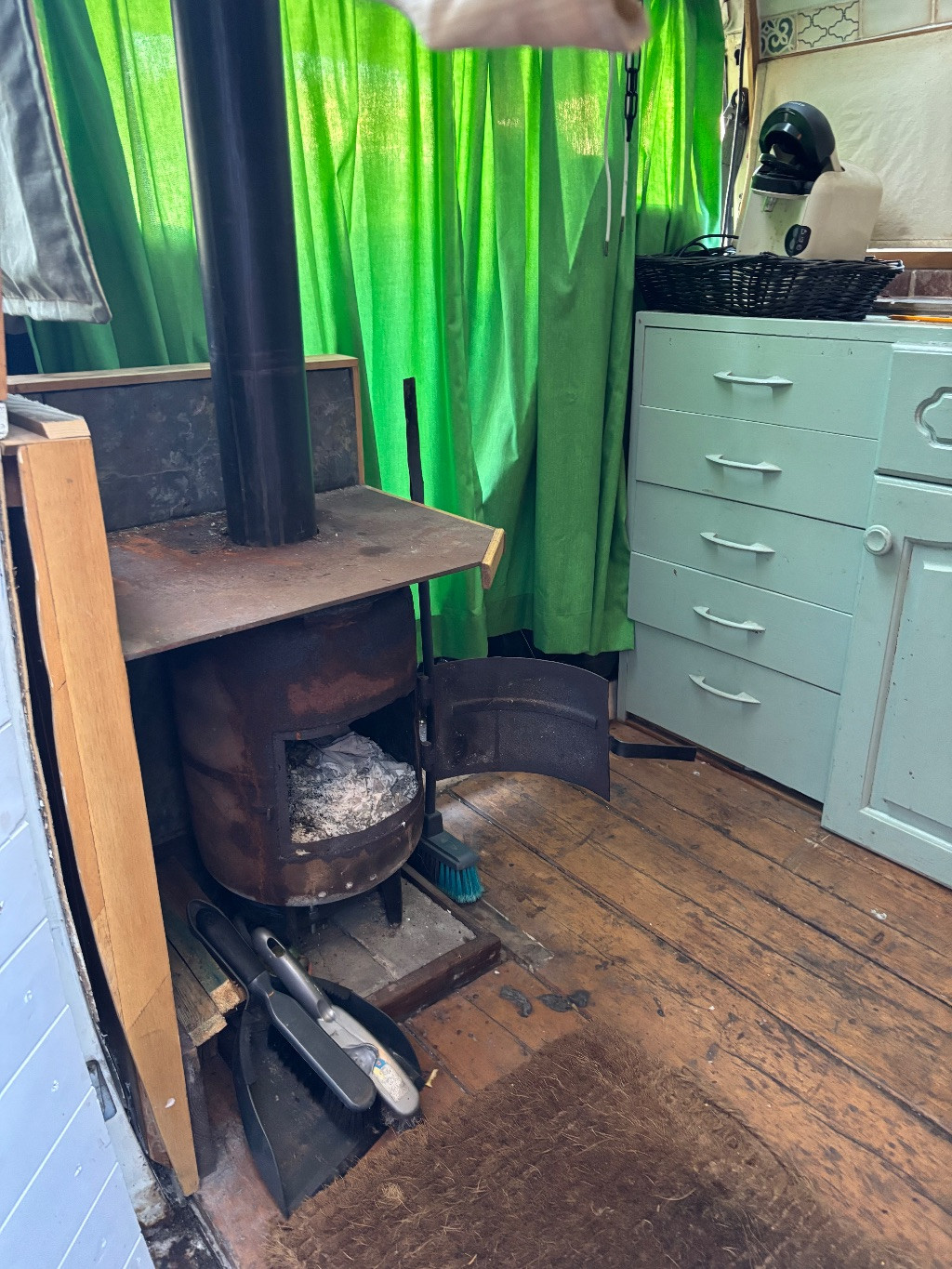 It was remodelled inside and has a little wood burning stove and grill. Water can be pumped from under the sink.
