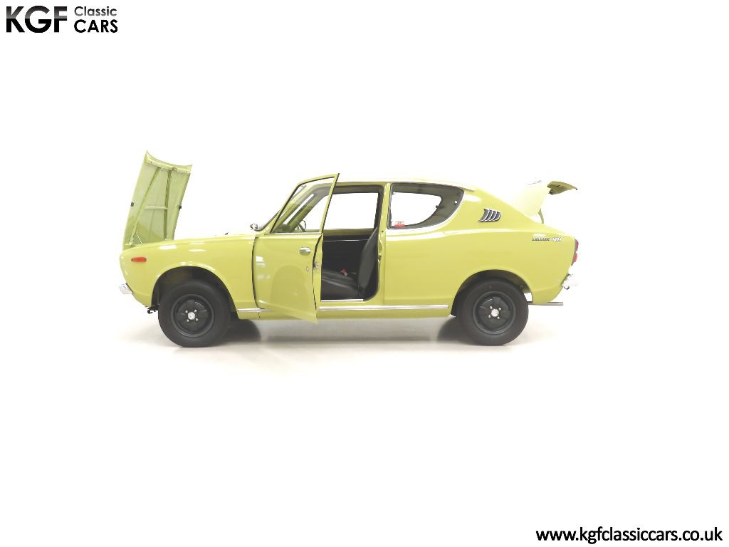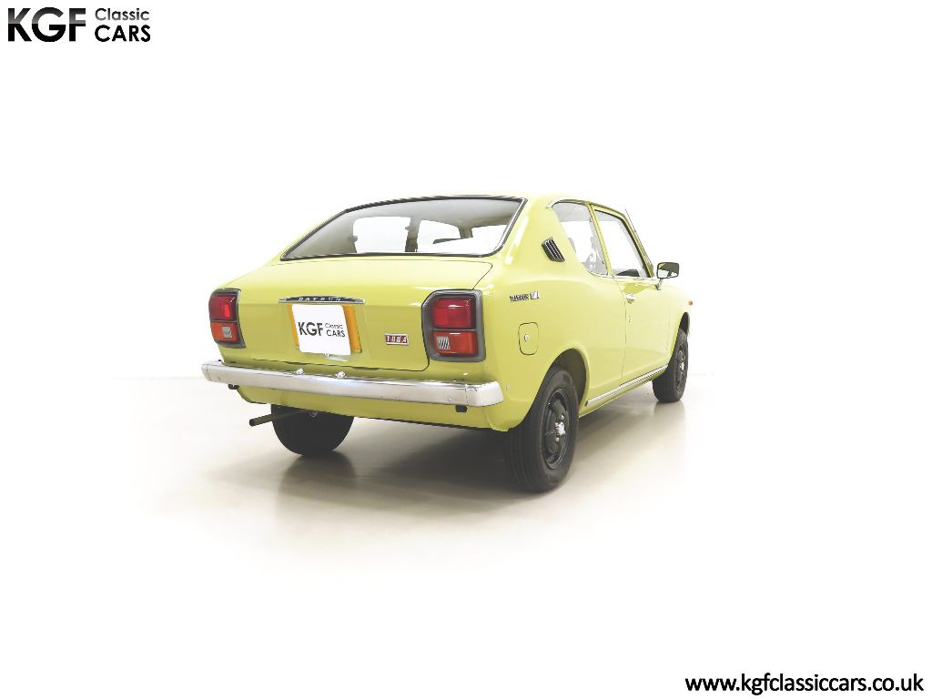 A surprisingly spacious small car that is low, lean and cute! What is more surprising however is the outstanding factory-built originality of this UK example. All pin straight panels, rubbers, chrome, trim, lights and glass are factory fitted. This survivor is finished in glossy Datsun Lime Yellow, (Code 353), and has no shade difference between panels. Due to the cars originality, each panel will have honest paint imperfections from tiny spidering to touched-in blebs, left entirely to cement how unique this unicorn is amongst a handful of restored survivors remaining. The rear quarter rubber bungs inserted from new where different longer bumpers fitted to non UK cars would normally be fitted, remain. All badges are correct and bright and even the wiper arms are still Mitsuba items. The excess glue applied on the production line to stick the window rubbers has now browned, but again, has been left to confirm authenticity. Recently discovered garaged at its first owners home means that the underside, wheel arch apertures and all shuts are in remarkable condition. The supplying dealer tax disc holder is still fitted to the front screen along with period correct number plates. It will be a further surprise if a more perfect, untouched, unrestored and factory correct example exists……