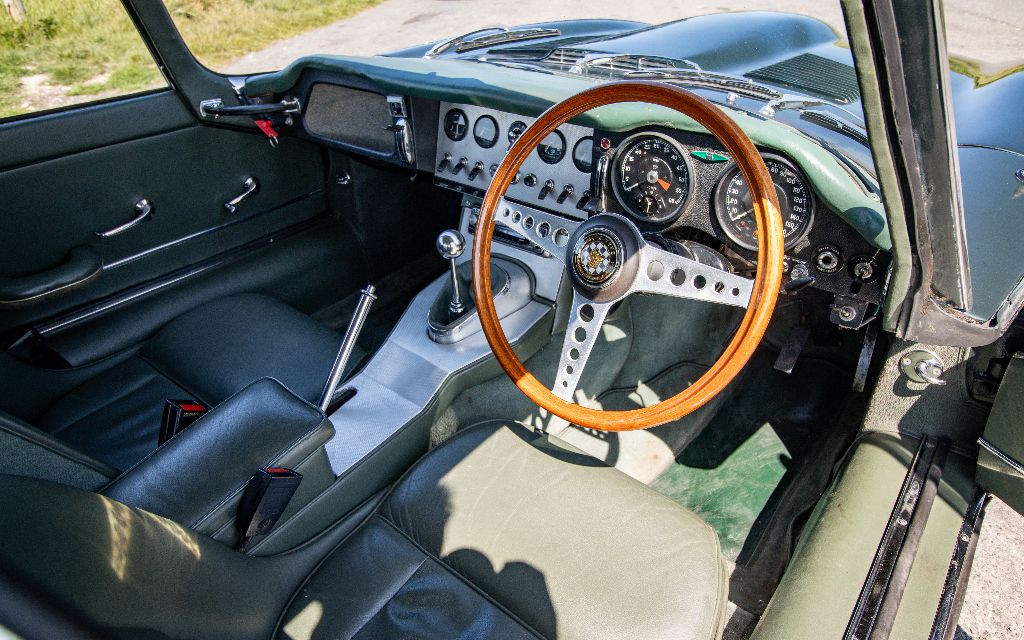 Peering over the elongated and curvy bonnet, it is obvious you are sat in a very special place and not all E-Types give you this privileged feeling, this one is special… Flick the key and she starts first turn. Having had engine work, an upgraded 5 speed dogleg gearbox, Coopercraft brakes, refurbished suspension and a cylinder head rebuild and upgrade, it really does make for a true driver’s car, as well as one for the aesthetes.