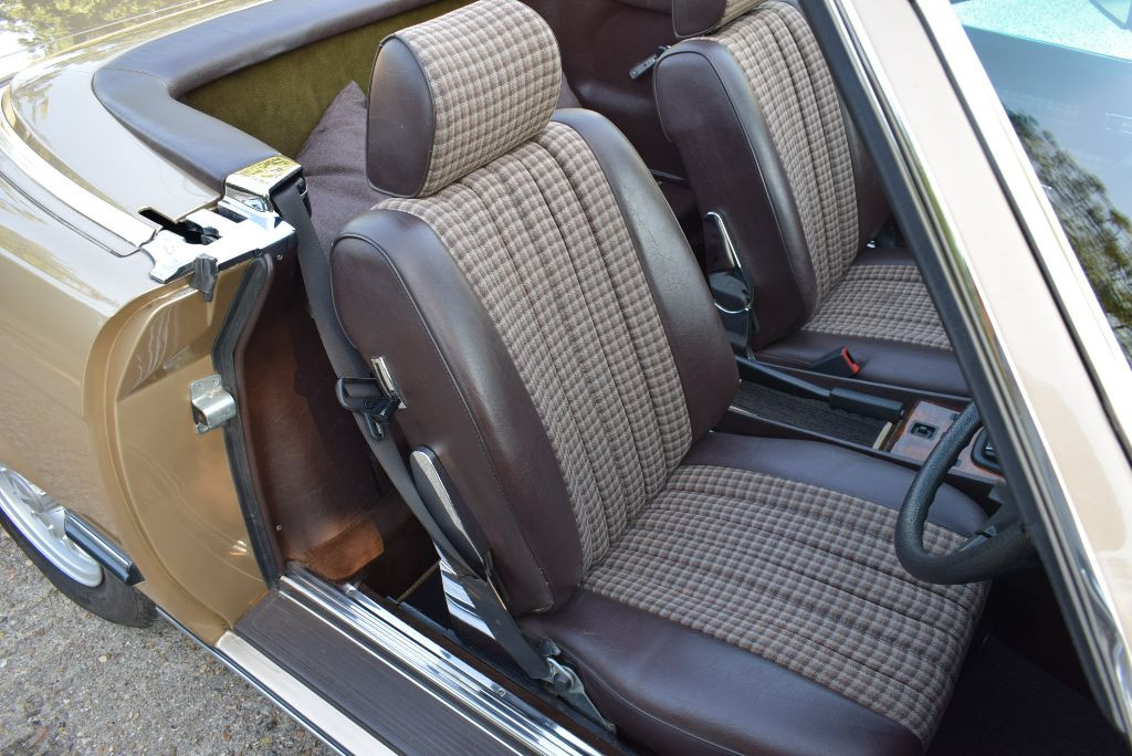 This particular super original Mercedes was specified in a superb colour combination of Champagne Metallic (code 473) with Dark Brown check cloth interior and a matching dark brown hood (code 8023). The soft top is in lovely original condition showing few signs of wear, the plastic windows being clear and undamaged and still bear the Mercedes Logo. It was also specified with the extremely desirable hard top in body colour which is supplied with the car and which turns the convertible into a well-sealed coupe complete with heated rear window suitable for winter motoring should the desire take you. Air conditioning and electric windows add to the cars usability. Finally the car is shod with lovely original Mercedes period alloy wheels (code 640) that are refreshingly free from scratches and scrapes.