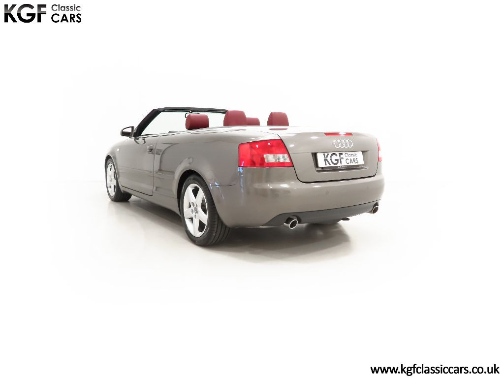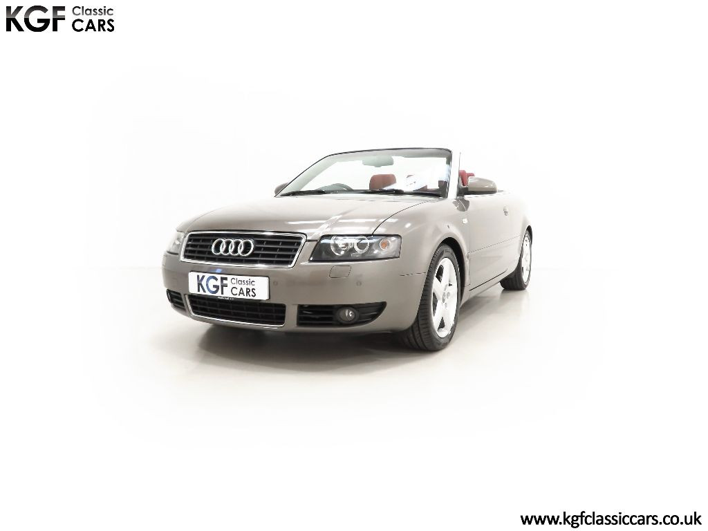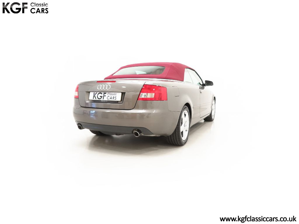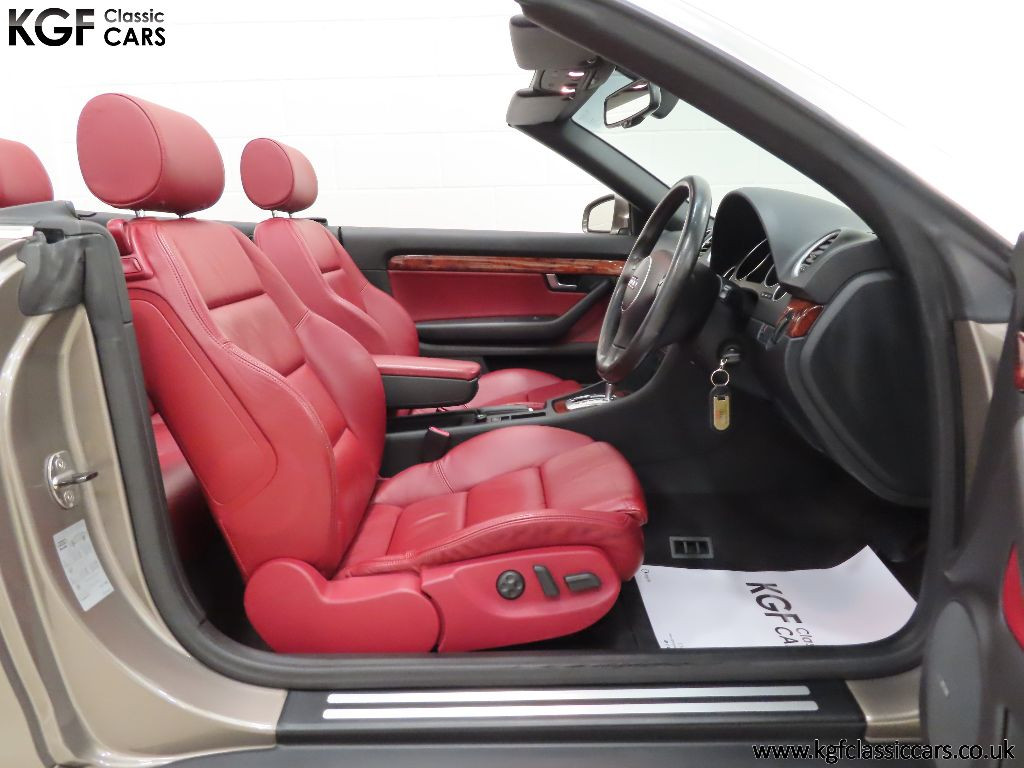 A beautiful colour combination, finished in factory optional Alpaca Beige Metallic, (Code Y5), with Red hood, (Code SF). The paintwork presents beautifully throughout with a deep uniform shine and the aluminium windscreen surround remains in superb condition. Having covered a mere 25,099 miles with just two owners from new, the bodywork is in exceptional condition with pin straight body panels free from damage. A sign of a conscientious owner can be seen with the Supaguard paint technology sticker applied when new at considerable cost and still attached to the front screen. Even upon meticulous scrutiny will you detect anything other than a few carefully touched in marks and being garaged from new, the underside and all apertures are remarkably clean. The stunning deep Red hood is perfect both in condition and full electric operation. Supplying dealership numberplates remain fitted and in reflection of the cars ultra-low mileage and garaged credentials, all glass, trim, lights and rubbers are perfect. A stunning example of this desirable Audi four-seater cabriolet preserved in remarkable condition.