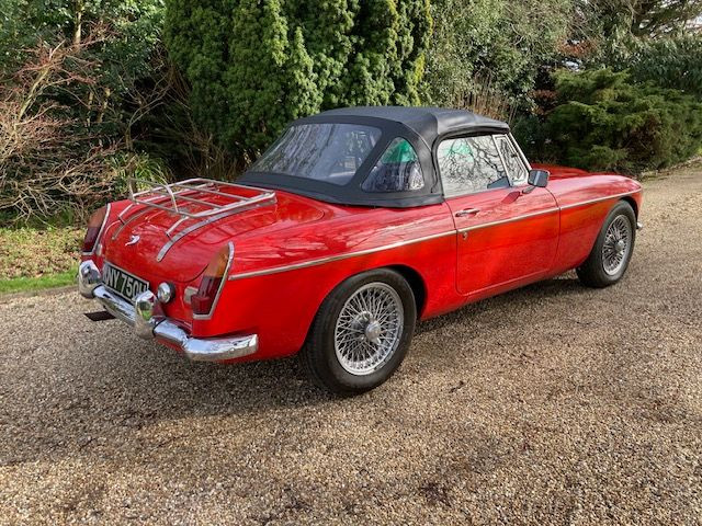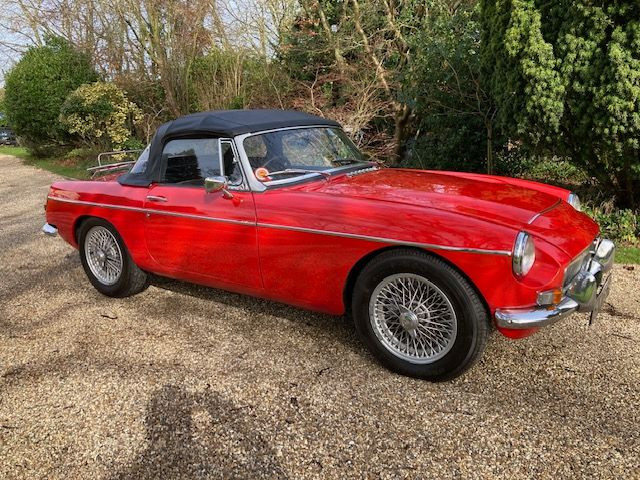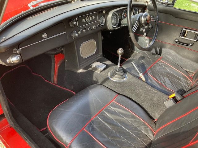 1969(H) MGC Roadster. Tartan Red with Black leather piped in Red and with a Black soft top. Wire wheels, manual gearbox with overdrive, Stainless Steel exhaust, Stainless Steel boot rack, Lumenition electronic ignition. 98,000 miles with a huge history folder of invoices and MOTs going back almost 40 years and copies of the registration documents from new. Appears to have had a major bare shell overhaul carried out by Murray Scott Nelson in the mid 1980s at which point the colour Tartan Red was selected ( she was Blue when new we believe ). Still in remarkable condition with a super straight bodyshell and has been extremely well maintained over the 40 years. One of the nicest examples we have owned for many years. Obviously Tax exempt and MOT exempt.