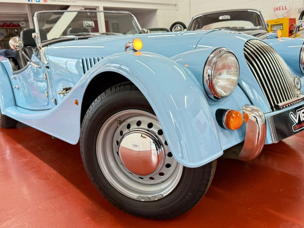 Front and rear chrome overriders, optional stainless steel rear luggage rack with screen holder, Lucas wing top sidelights, stainless badge bar with Morgan Sports Car Club enamel badge, round door mirrors, locking door handles, high-level brake light and Lemans style filler cap.