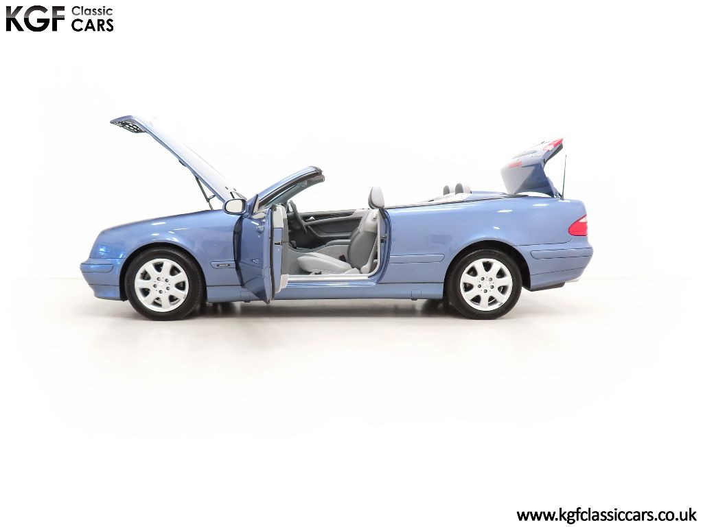 This sporting CLK320 Avantgarde is finished in factory optional Quartz Blue metallic, (Code 935), and the paintwork remains 100% original. Having covered just 15,661 miles with one owner from new, the car has always been garaged and used primarily in dry conditions, and as such the paint finish is near flawless. The beautifully made trim sections, lights and badges are as new, and the original quality blue multi-layer hood is near perfect. Inspection of the impeccable underside will further cement this example’s utterly cosseted existence. Supplying dealer branded Riverdale Reading number plates remain fitted. An outstanding example in all respects and collector grade quality.