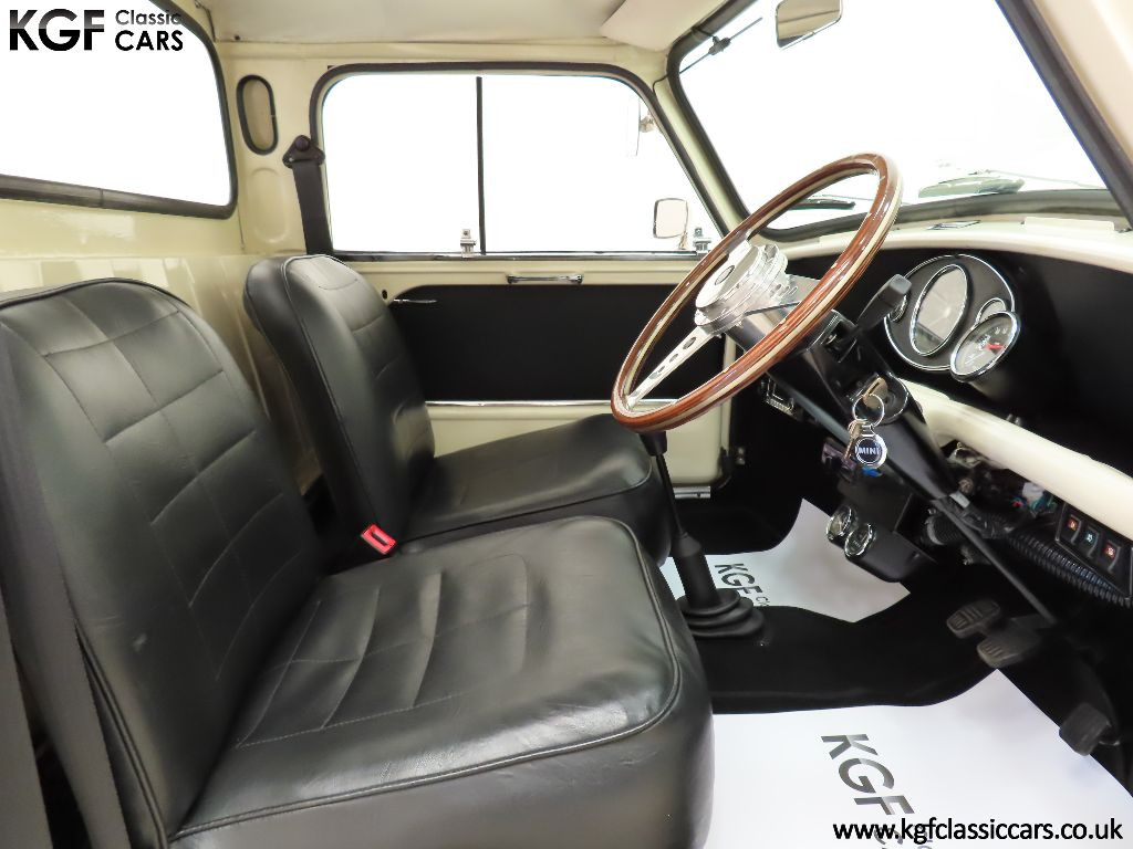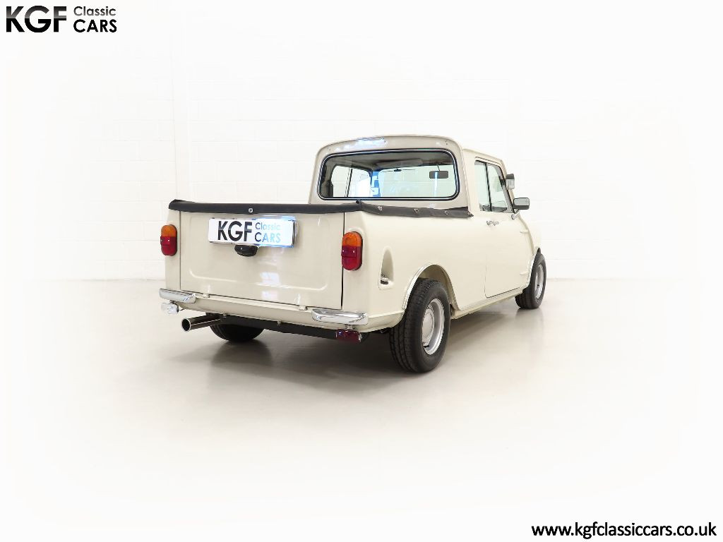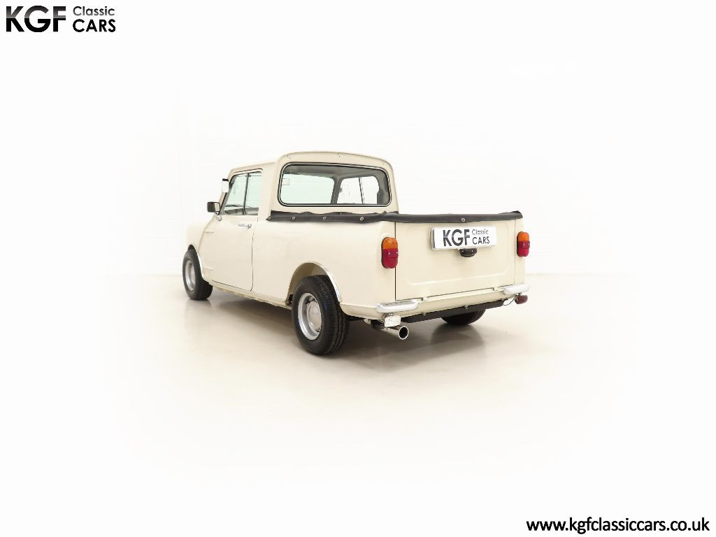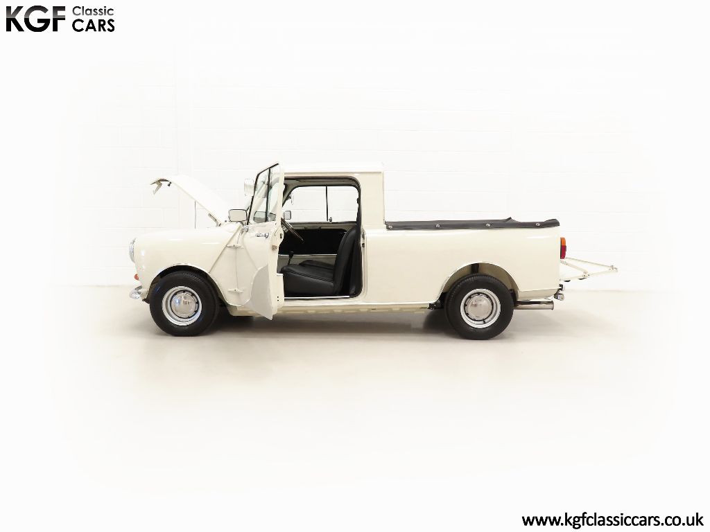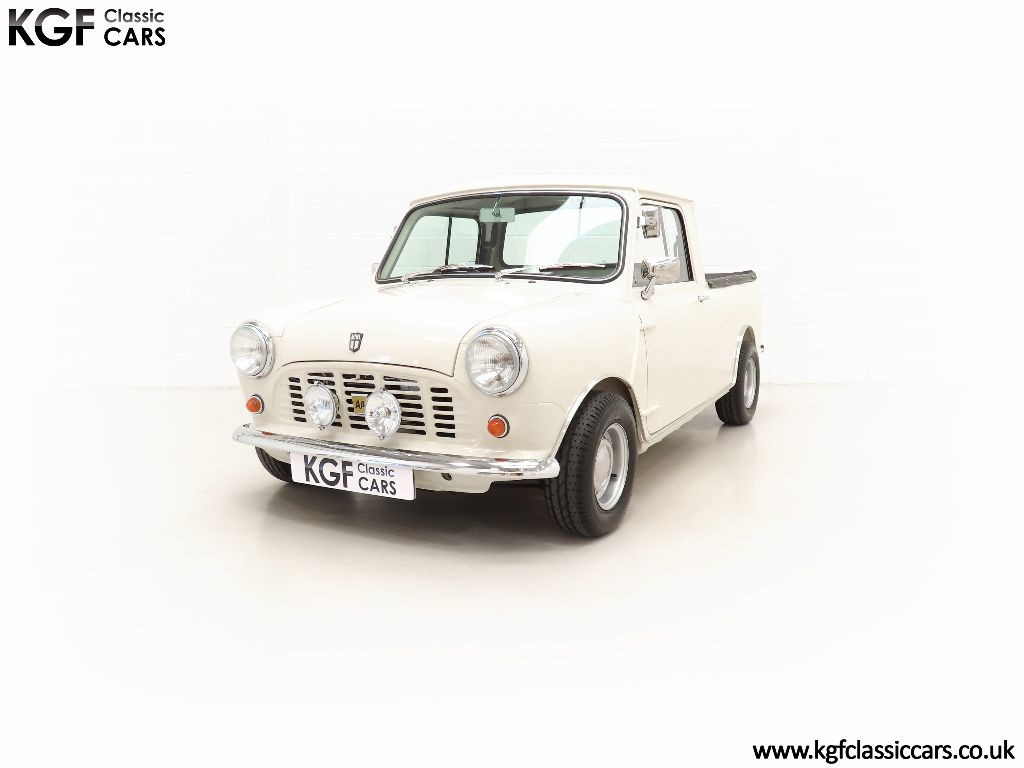 What an absolute show stopper! When KGF Classic Cars purchased this rare Light Commercial Vehicle, (LCV), Pick-up as part of a package classic Mini deal to include two Mini vans in 2019, we just had to keep it! Finished in Old English White it adorned our company logo, now removed without trace, and was a fantastic promotional tool and versatile vehicle, so both good looking and hard working! Tastefully accessorised with expensive period features such as genuine Cooper steel wheels, Lucus lighting and much more, this example presents really well with a clean body-coloured underside too. The correct pressed metal front grille that is not removable like the saloons and sliding windows are still fitted and all chrome bumpers have a bright mirror finish. The simple fold-down tailgate gives easy access to the ample load space which, along with the rest of this commercial vehicle, has seen very little recent hard work! A stunning show piece.