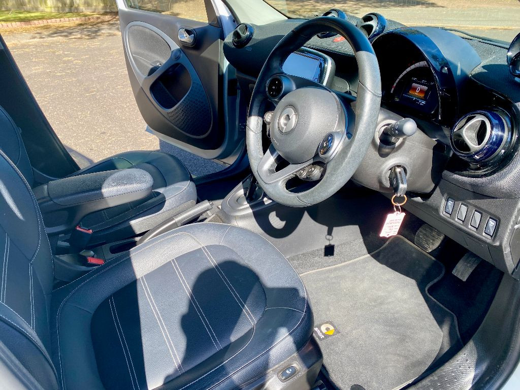 This Smart EQ Exclusive (fully electric, charge at home from a normal plug or from charging station) the top of range the model is finished in Cool Silver Metallic with a full black leather interior and only 1 Owner from new. Spec includes but is not limited to: 16" Diamond cut alloys, privacy glass, twin pan glass roof with sunblinds, front fogs, DRL's, Apple carplay, Sat nav, rear cam, reversing sensors, rain sensor, air con/climate control, electric windows/mirrors, centre armrest, OBC, Cruise control, Heated front and rear seats along with Smart logo'd overmats. Full Smart MB service history with service taking place @ 5,117 - 10,386 - and 14,555 respectively. Supplied with 2 keys and full book pack...OFFERS - P/X - SWAPS CONSIDERED - DOOR TO DOOR DELIVERY AVAILABLE, FREE WITHIN 100 MILE RADIUS…